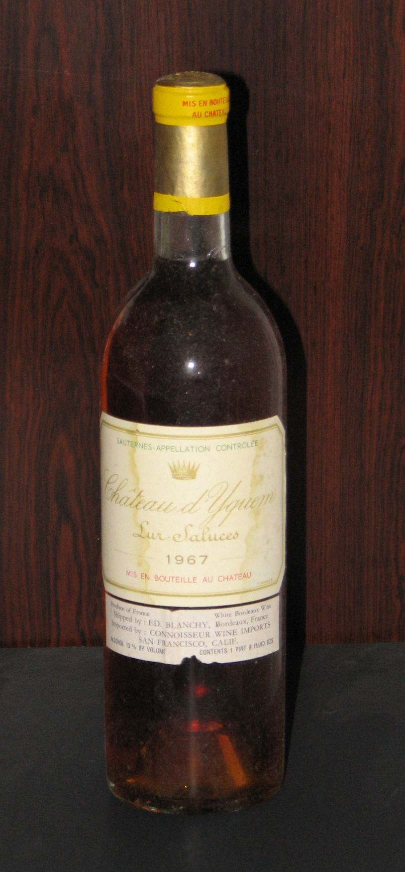 Tear at the bottom of importer's label, staining on d'Yquem label